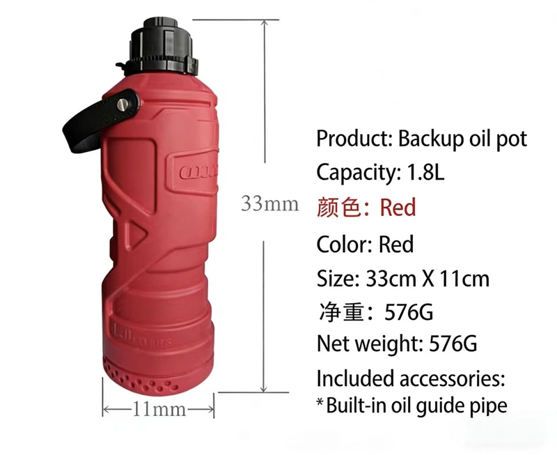 This product is a universal, portable auxiliary fuel tank designed for motorcycles. With a 1.8L capacity, it effectively meets emergency refueling needs during long-distance motorcycle tours. It features a built-in pouring spout that ensures a smooth, effortless flow of fuel without the need for any additional tools. The tank body is constructed from industrial-grade, oil-resistant PE using a seamless, one-piece molding process; it is highly resistant to oil, corrosion, drops, and abrasion. Furthermore, the included leak-proof cap completely eliminates any risk of fuel leakage. Designed with a convenient carrying strap, the tank is easy to mount and transport; its lightweight construction ensures it adds no unnecessary burden to the rider. This makes it an essential emergency accessory for motorcyclists embarking on long-distance journeys or outdoor adventures.
