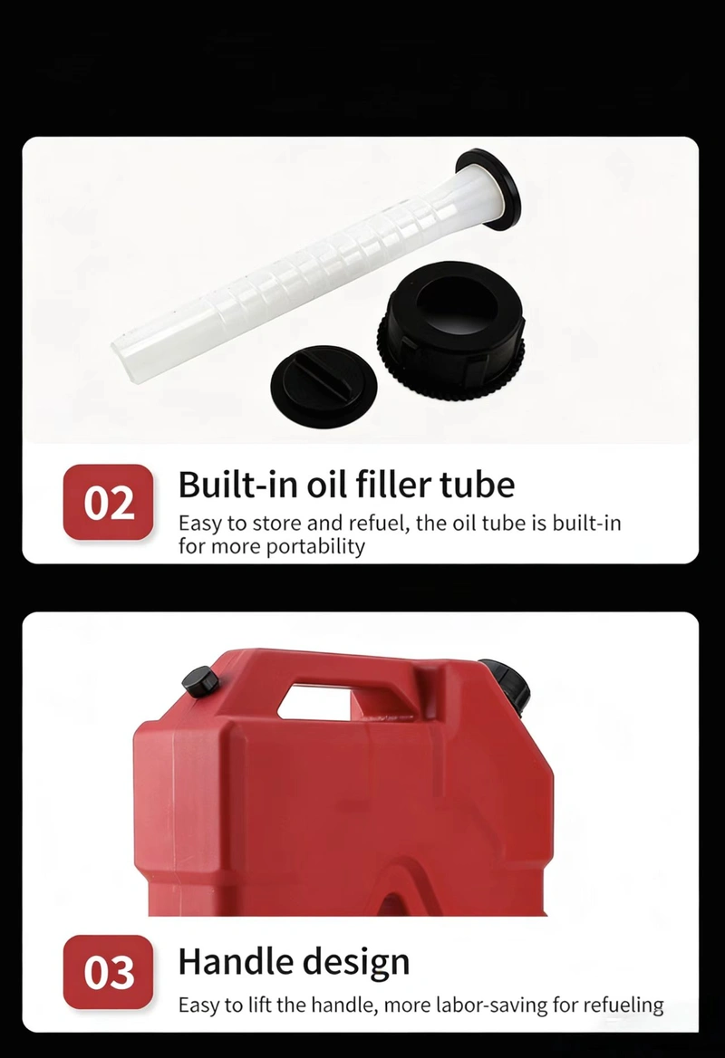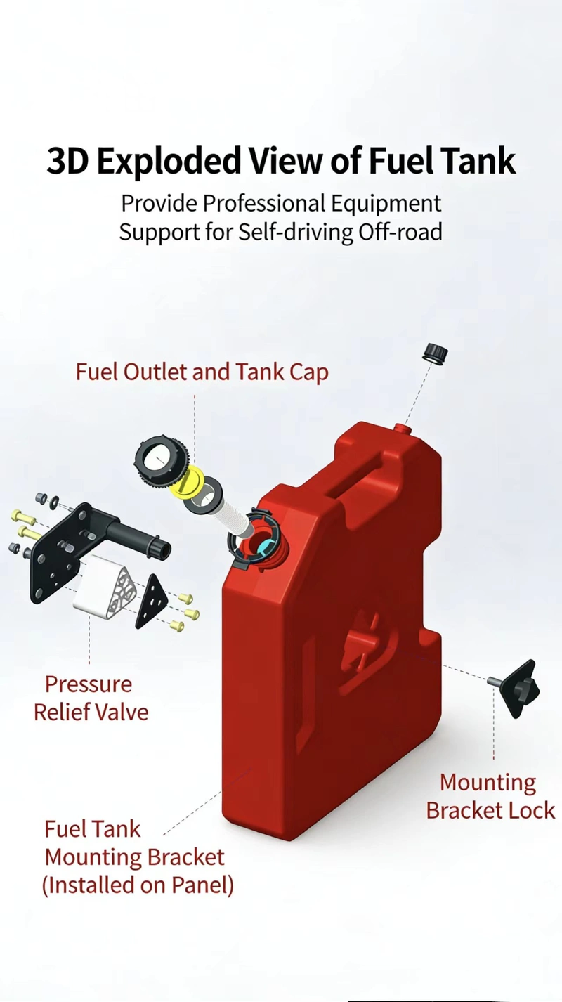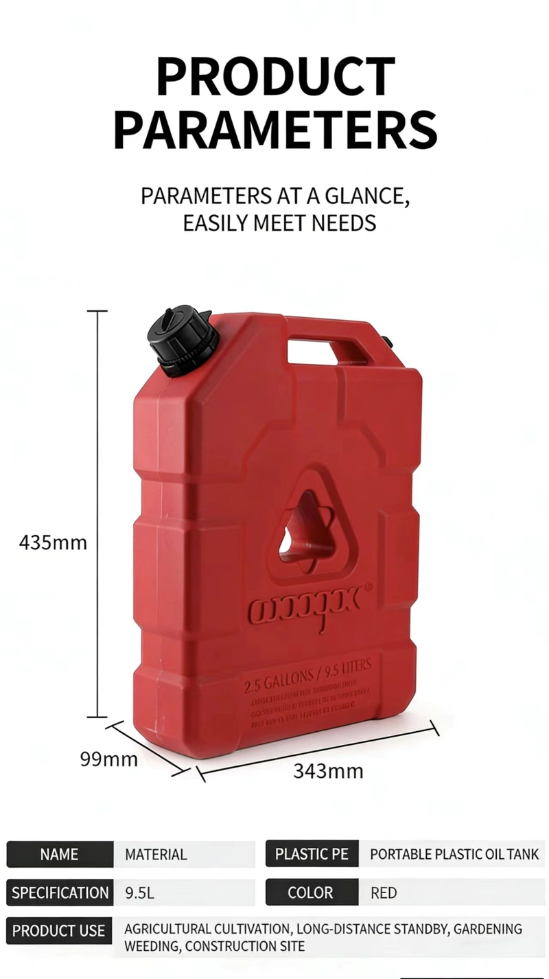 This product is a 9.5L high-capacity auxiliary fuel tank designed exclusively for motorcycles and off-road vehicles. Constructed from industrial-grade, oil-resistant PE using a seamless one-piece molding process, it is rugged, leak-proof, and features a built-in pressure relief valve. It comes complete with a dedicated mounting bracket and locking mechanism—offering robust protection against theft and tampering—making it the ideal solution for refueling needs during long-distance motorcycle tours and off-road expeditions.