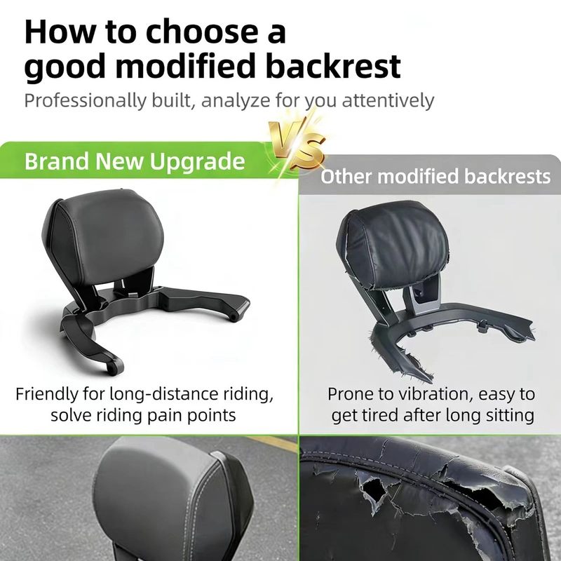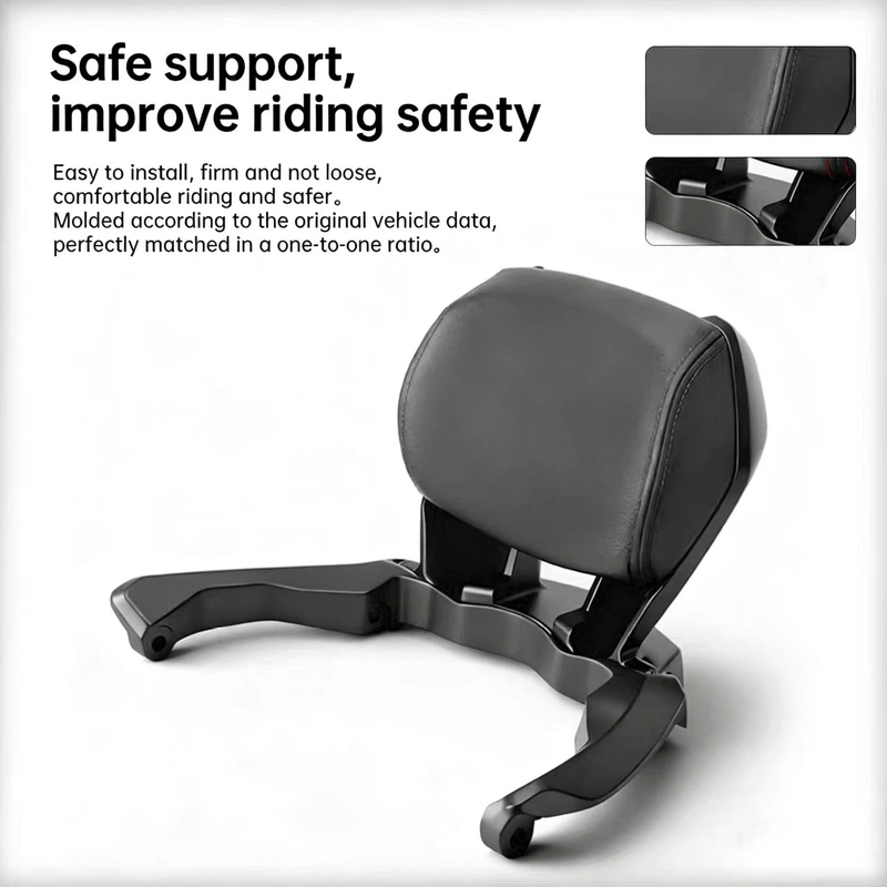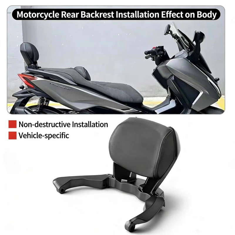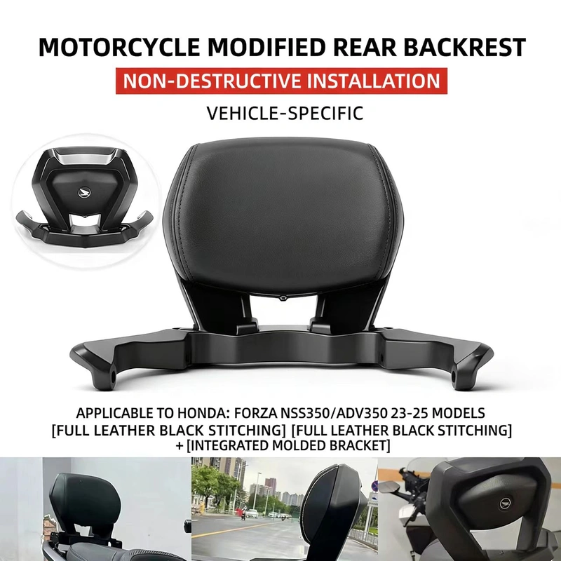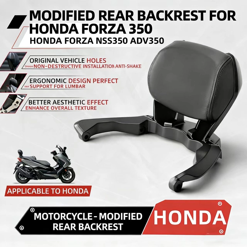 This product is a custom-tailored backrest designed specifically for the Honda FORZA NSS350 (2023–2025 models). Its one-piece molded alloy bracket features a robust structure that is highly resistant to impact and built for long-term durability. The surface is finished in premium microfiber leather—a material that is both waterproof and stain-resistant—while the high-resilience sponge core provides soft yet supportive cushioning for the lower back. Featuring an ergonomic contour that perfectly aligns with the natural curvature of the spine, this backrest significantly alleviates back and waist strain for the rear passenger during long-distance rides. Installation is completely non-destructive, utilizing the motorcycle’s original mounting points without the need for drilling; it fits seamlessly with the bike’s body lines, ensuring a secure, wobble-free ride that preserves the vehicle’s original aesthetic integrity. This is a premium aftermarket accessory designed to significantly enhance the comfort and quality of the rear passenger’s riding experience.