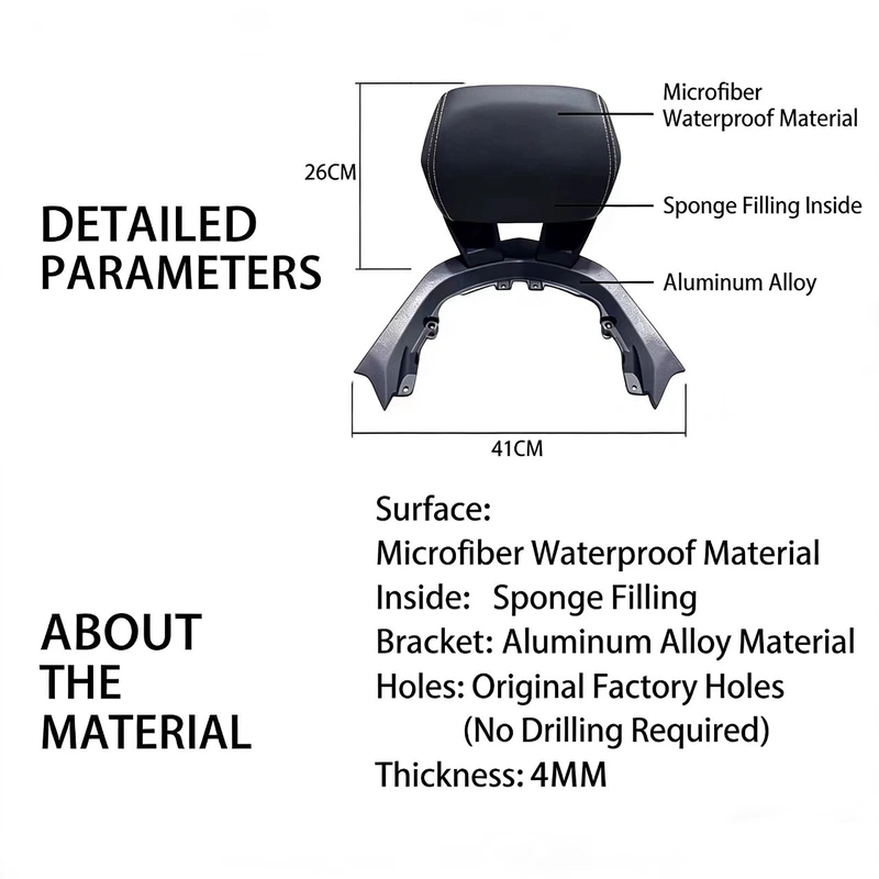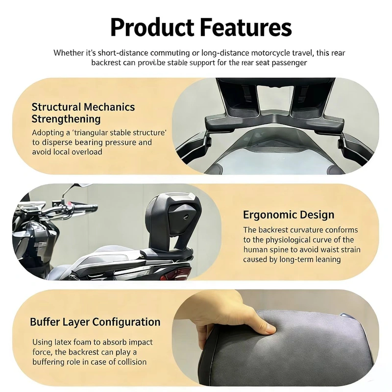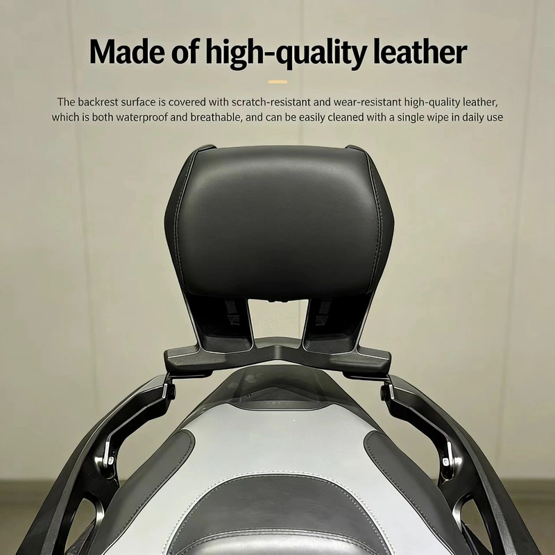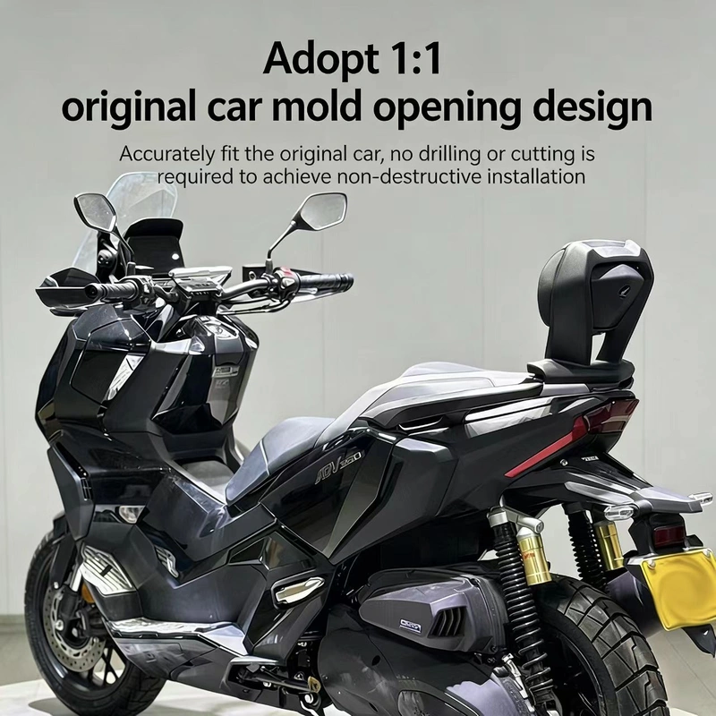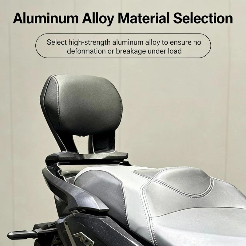 This product is a dedicated backrest designed exclusively for the Honda ADV350 (2023+ models). Featuring an ergonomic design that contours to the spine, it effectively alleviates lower back fatigue for passengers during long-distance rides. Its triangular stability structure effectively distributes pressure, while the high-resilience sponge core provides excellent cushioning and shock absorption. The waterproof microfiber fabric is highly abrasion-resistant and easy to clean. Supported by a sturdy and durable 4mm aluminum alloy bracket, the unit utilizes original factory mounting points for a drill-free installation that fits seamlessly against the vehicle body—making it a premium aftermarket accessory for significantly enhancing passenger comfort.