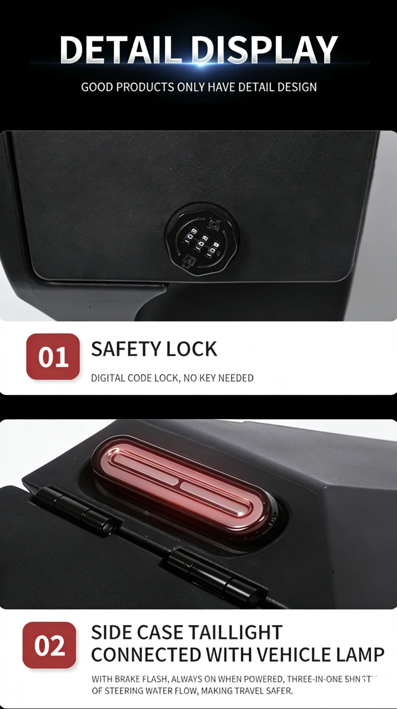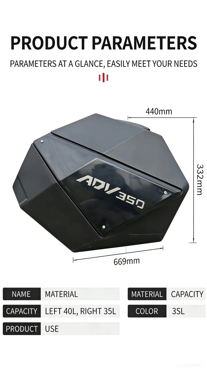 This product is a set of side cases designed specifically for the Honda ADV350. Featuring a high-capacity design (35L + 40L), the cases are constructed from high-strength, industrial-grade PE material, ensuring exceptional durability, impact resistance, and protection against water and dust. The system is equipped with a dual-unlock mechanism—combining a combination lock with keyless access—and supports synchronized operation with the motorcycle’s turn signals. Designed for non-destructive installation that requires no modifications to the original vehicle, these side cases effectively expand storage capacity and enhance riding safety, making them ideal for both daily commuting and long-distance motorcycle touring.